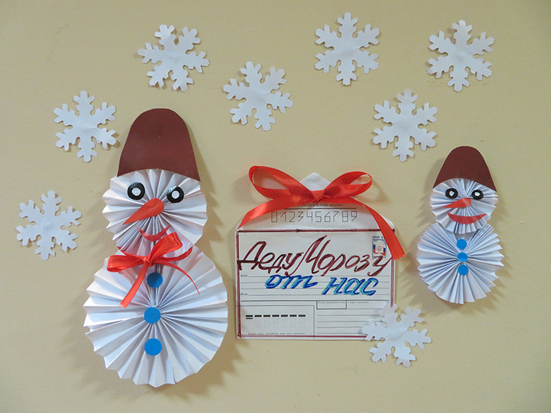 Дети обожают новогодние поделки! Для изготовления гофрированного снеговика наши маленькие читатели использовали белую и цветную бумагу, шелковые ленты, клей-карандаш и ножницы. Для того чтобы снеговик доставил все просьбы к Деду Морозу, дети написали свои заветные желания на праздничных открытках и положили их в волшебный конверт.