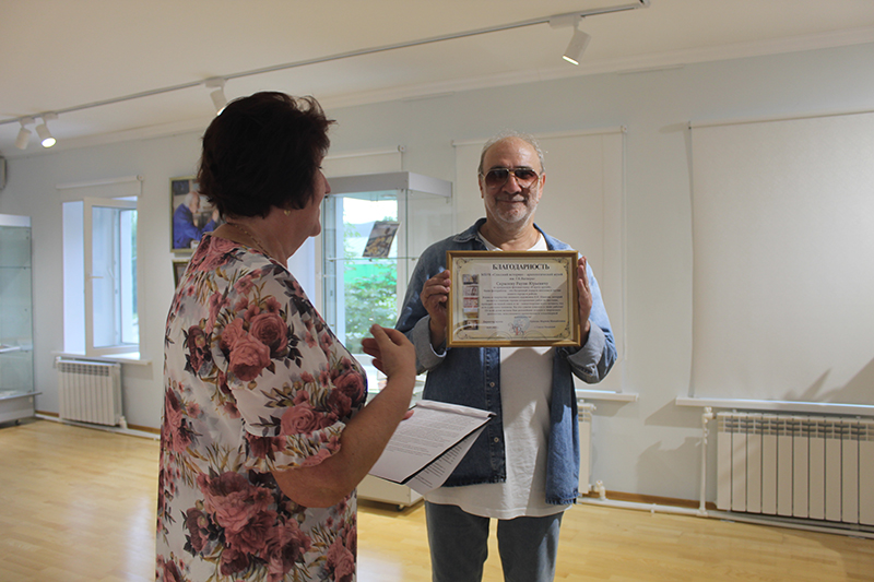 Сергей Алексеевич Кочетков поздравил всех с долгожданным радостным событием и выразил особую признательность Наталье Николаевне Гришиной и Раулю Юрьевичу Скрылеву за то, что они нашли возможность приехать на открытие выставки в г. Спасске – на исторической родине Виктора Ивановича Иванова.