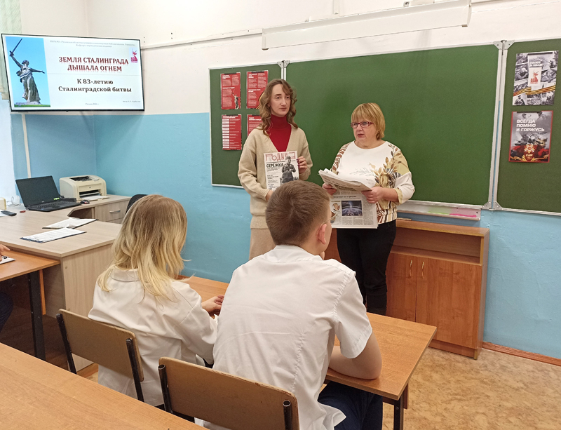 2 февраля исполняется 83 года со дня окончания Сталинградской битвы. Сотрудники кафедры периодических изданий провели для учащихся старших классов школы № 10 патриотический час, посвященный героям исторического сражения.