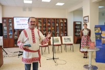 Георгий Грязев, главный редактор издательства, на удмуртском и русском языках поблагодарил сотрудников библиотеки за приглашение на единственный в стране фестиваль национальной книги и прочитал на удмуртском языке стихотворение нашего замечательного земляка Сергея Есенина «Белая береза».