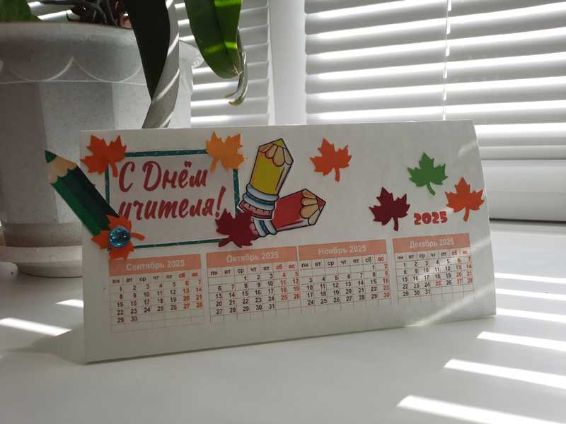 Не секрет, что рабочая нагрузка у учителя очень большая. Организовать рабочий процесс, запланировать занятия и мероприятия, не пропустить важную дату поможет настольный календарь. Именно такой подарок приготовили своими руками мальчишки и девчонки. Свои работы они украсили тематическими вырезками и стразами.