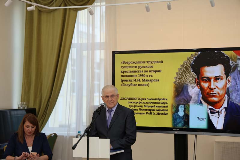 Юрий Александрович Дворяшин, доктор филологических наук, профессор, ведущий научный сотрудник Института мировой литературы РАН (г. Москва), говорил о возрождении трудовой сущности русского крестьянства во второй половине 1930-х годов в романе «Голубые поля».