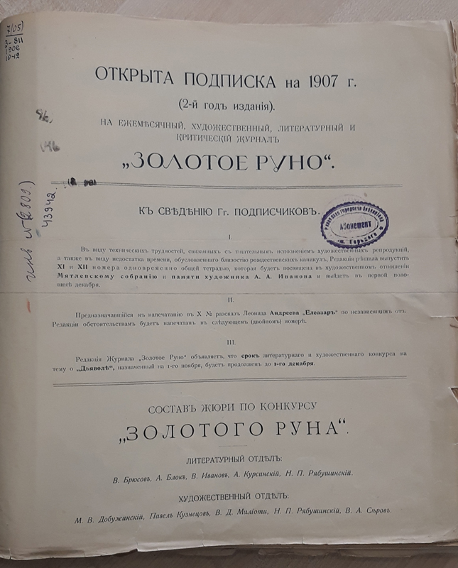 В Центре редких и ценных изданий библиотеки имени Горького хранятся отдельные номера журнала «Золотое Руно» за 1906 г. (№№5-6, №№10-12).