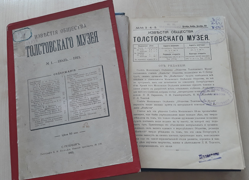 В Центре редких и ценных изданий библиотеки имени Горького хранятся отдельные номера журнала «Известия общества Толстовского музея» за 1911 год.