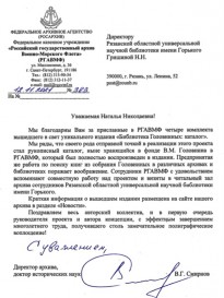 Изданный в июле текущего года сводный каталог библиотеки Василия Михайловича и Александра Васильевича Головниных, подготовленный коллективом Рязанской областной универсальной научной библиотеки имени Горького, получил широкий резонанс в профессиональном сообществе. В адрес библиотеки поступает много положительных отзывов от коллег и партнеров из Москвы, Санкт-Петербурга, Воронежа, Петрозаводска, Астрахани, Хабаровска, Южно-Сахалинска и других городов.
