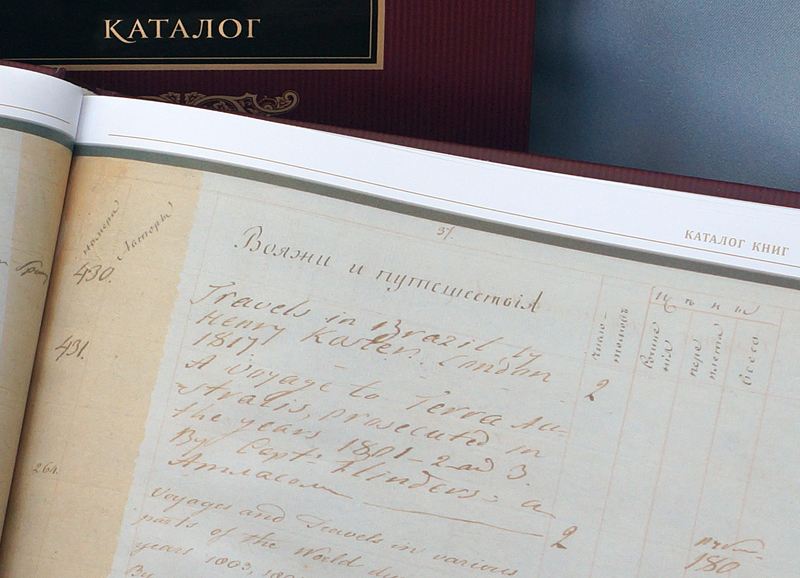 РГАВМФ хранит в своих фондах одну из самых интересных частей собрания вице-адмирала – его рукописное наследие, включающее в себя каталог книг, составленный В. М. Головниным в первой четверти XIX века. Значение этого документа в деле реконструкции трудно переоценить: это важнейший источник сведений по истории формирования библиотеки мореплавателя, путях ее пополнения и рассеивания, тематическом составе. Каталог содержит богатый материал для изучения жизни и деятельности В. М. Головнина, его дружеских и профессиональных связей и убедительно доказывает, что книги были неизменными спутниками вице-адмирала даже в самых отдаленных уголках земли. Факсимиле рукописи и ее расшифровка опубликованы нами в отдельном томе, дополняющем сводный каталог. Приобрести издание можно в нашем интернет-магазине: https://rounb.ru/news/biblioteka-golovninyh-katalog