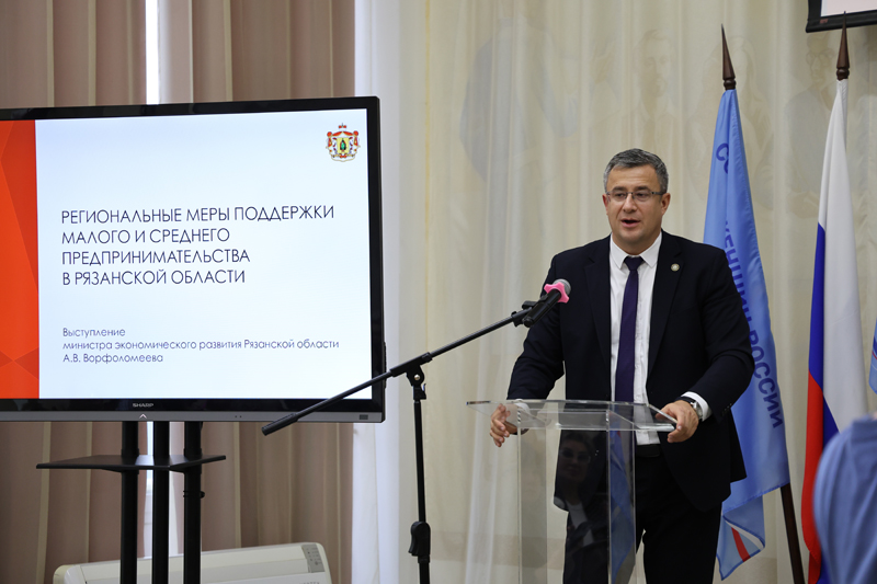 В деловой части программы с докладом о региональных мерах поддержки субъектов малого и среднего бизнеса выступил министр экономического развития Рязанской области Андрей Владимирович Ворфоломеев, подчеркнув, что «вовлечение женщин в предпринимательскую деятельность – стратегическое направление государственной политики».