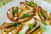 Еще одно блюдо, которое существует, пожалуй, только в России и еще с советских времен полюбилось как новогодний деликатес – это бутерброды со шпротами. Способ их приготовления чрезвычайно прост, ведь в списке ингредиентов присутствуют только два продукта: сами шпроты и хлеб. Дополнительной заправки не требуется, так как в консервах содержится большое количество масла. Для придания более интересного вкуса можно добавить маринованные огурчики. Нехитрое блюдо и сегодня будет украшением стола и отличной закуской, если нарезать хлеб не крупно, на «один укус».