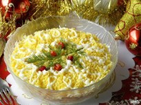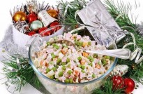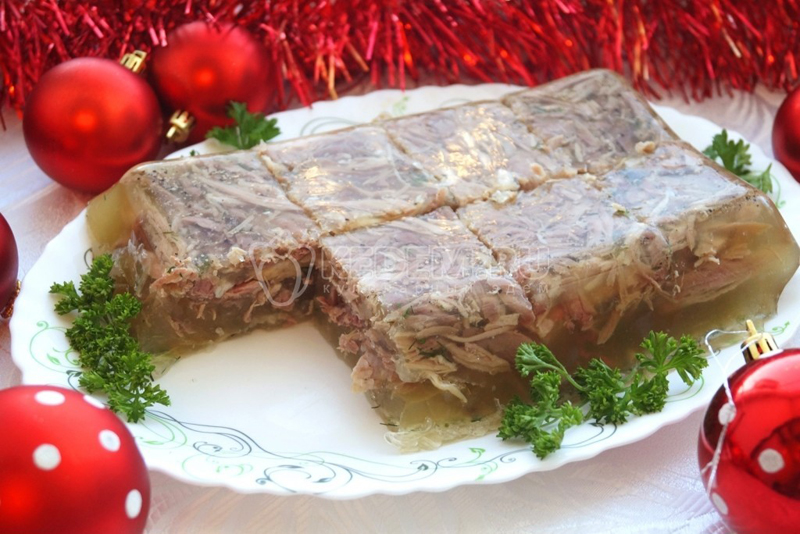 Еще один не менее популярный новогодний салат – «Мимоза». Вот он – типичный представитель советской кухни. Его готовят из самых простых продуктов: яиц, рыбных консервов, сыра, лука и майонеза. Название он получил из-за внешнего сходства поверхности, украшенной сыром и зеленью, с молодыми цветками мимозы. Интересно, что так называемого «классического» рецепта «Мимозы» не существует, каждая хозяйка готовит его по-своему. На новогоднем российском столе зачастую присутствует и холодец. Эта мясная закуска отлично вписывается в общую атмосферу праздника. Правильно и вкусно приготовленный холодец станет настоящим украшением новогоднего стола. Кто-то покупает для холодца свиную рульку, кто-то – говяжьи ножки. Есть хозяйки, которые обходятся лишь куриным мясом, утверждая, что свиной и говяжий холодцы – слишком жирные. Но в каждом случае блюдо получается сытным и красивым. Подают это блюдо обычно с горчицей или хреном. Будьте готовы, что гости попросят добавки.