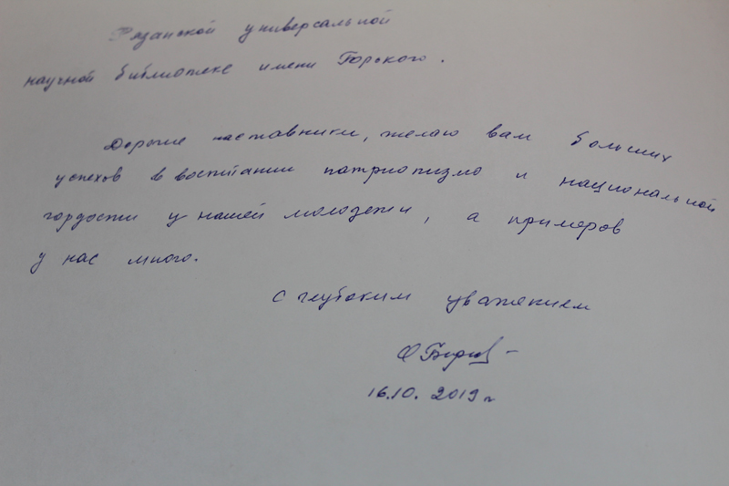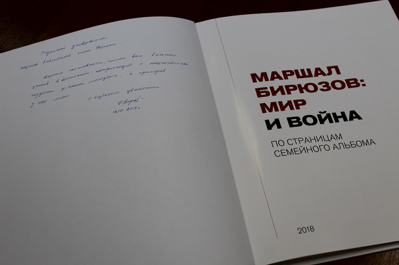 В дни работы IV Патриотического форума «Наука побеждать», посвященного в этом году 115-летию со дня рождения нашего земляка, полководца Великой Отечественной войны, маршала Советского Союза С.С. Бирюзова, мы получили в подарок книгу «Маршал Бирюзов: мир и война. По страницам семейного альбома» с теплой дарственной подписью дочери маршала О.С. Бирюзовой-Зотовой. Книгу передал муж Ольги Сергеевны Владимир Сергеевич Зотов.