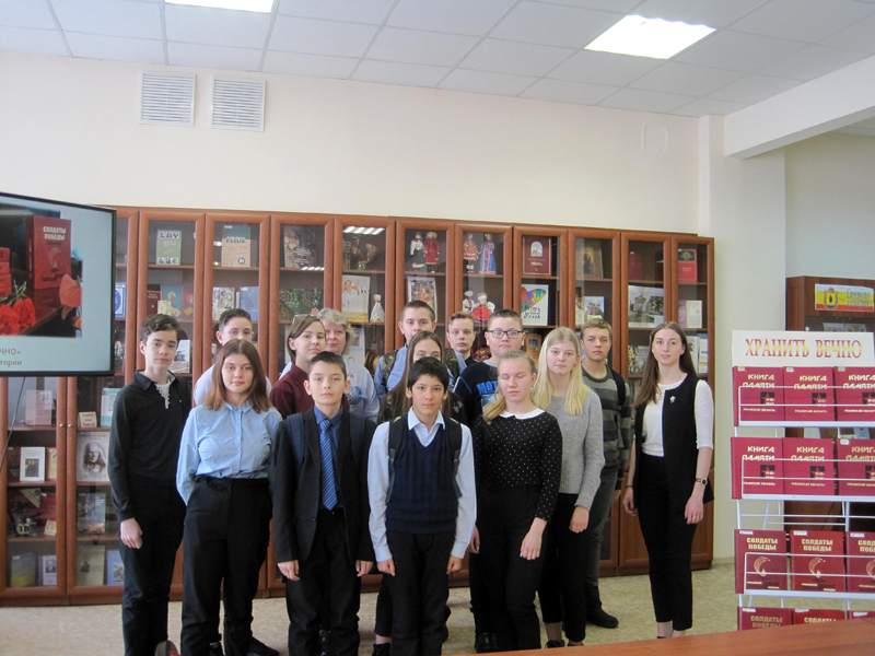 Дети узнали о фронтовике, писателе, поэте, заслуженном деятеле культуры Российской Федерации Борисе Ивановиче Жаворонкове, услышали его обращение к читателям библиотеки. Школьники познакомились с творчеством детского писателя Анатолия Васильевича Митяева, который долгое время занимал должность главного редактора журнала «Мурзилка», работал на киностудии «Союзмультфильм»; посмотрели запись церемонии передачи книги «Солдаты Победы» в Центральный музей Великой Отечественной войны для вечного хранения. Ребятам показали издания, посвященные участникам Великой Отечественной войны, подготовленные сотрудниками библиотеки.