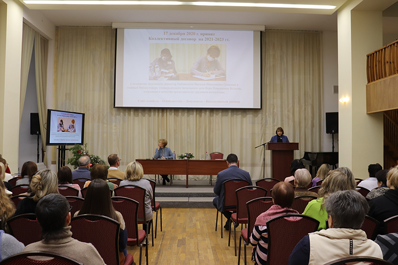Председатель профкома поблагодарила администрацию библиотеки за постоянное внимание к комплексу мероприятий по обеспечению безопасности и комфорта труда сотрудников библиотеки. Результатом продуктивной работы в этом направлении стало успешное участие библиотеки в региональном этапе Всероссийского конкурса «Российская организация высокой социальной эффективности». Также Людмила Николаевна пригласила сотрудников библиотеки вступать в ряды членов профсоюза.