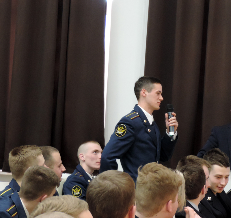 Почетные гости подробно рассказали о своем жизненном пути, профессиональных достижениях и активном участии в современной жизни. Анатолий Павлович и Анатолий Николаевич успели поработать в двух правовых системах – советской и российской, они поделились с молодежью своим мнением о развитии отечественного законодательства. Курсанты и студенты задали заслуженным юристам свои вопросы.