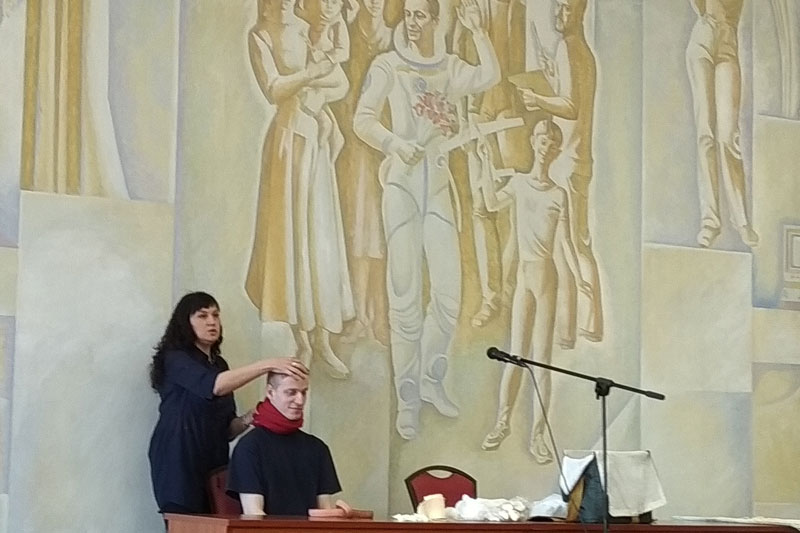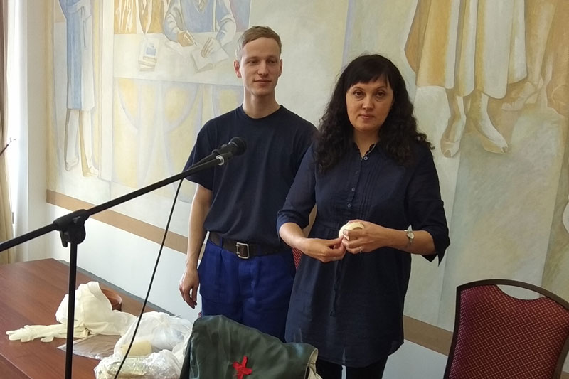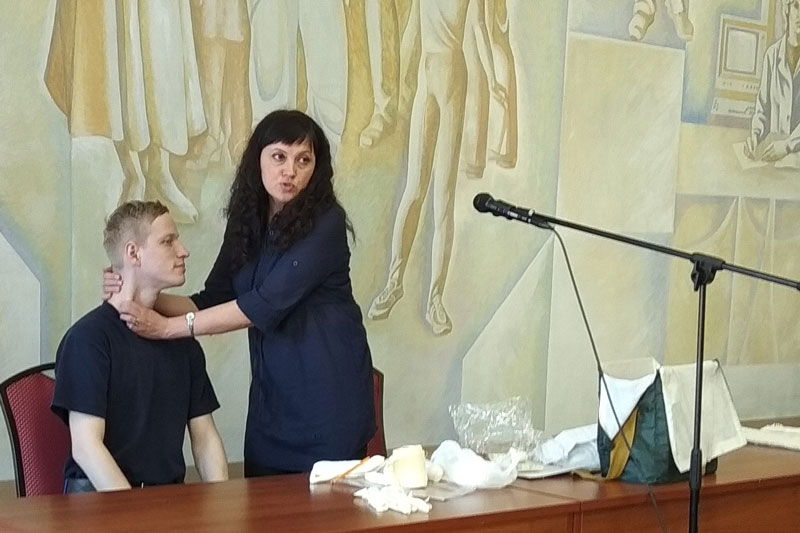 Юлия Викторовна Харлашкина, медицинский работник поликлиники №14, провела занятия с применением наглядных пособий. Полученные навыки позволят, в случае надобности, реально помочь при сердечном приступе и остановке сердца; при повреждениях различного рода, таких как раны и кровотечения, переломы, ожоги, обморожения и так далее.