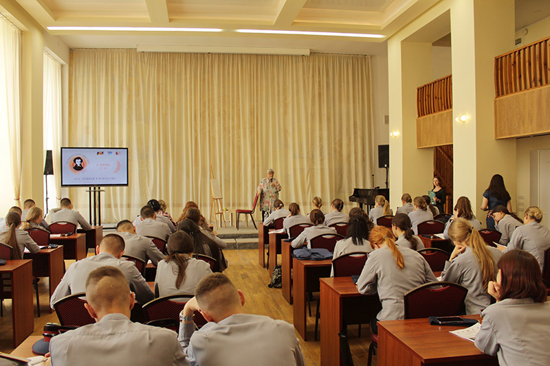 В большом конференц-зале под звуки классической музыки художник-педагог, член Союза художников России и Международной федерации художников Светлана Мурадова создавала живописный портрет А.С. Пушкина.