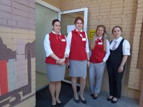 В день открытия гостей встретили библиотекари, читатели-активисты и ведущая праздника в образе сказочного персонажа – Пчелки Майи. Они пригласили участников церемонии пройти по новым залам и ознакомиться с пространством модельной библиотеки, в дизайн-проекте которой использована железнодорожная тематика и атрибутика, а также цитаты из книг о поездах.