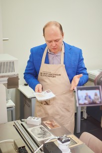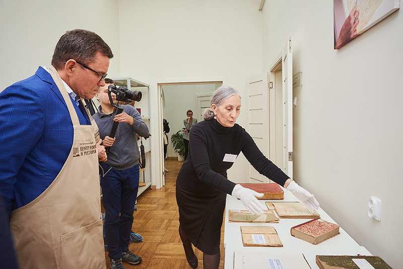 В течение всей экскурсии сотрудники открывшегося центра демонстрировали работу с книжными изданиями, плакатами, документами. В настоящее время в обновленном центре библиотеки работает семь сотрудников: заведующий центром, четыре художника-реставратора, два переплетчика. В октябре – ноябре 2022 года сотрудники Центра прошли обучение по программам дополнительного профессионального образования на производственной базе и учебном реставрационном классе Российской государственной библиотеки.