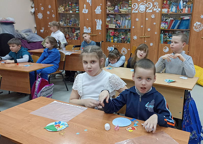Детям рассказали о традициях празднования Нового года и Рождества на Руси, о появлении первых елочных украшений в России, о том, что Дед Мороз живет в Великом Устюге – городе с богатой и древней историей. Школьники посмотрели отрывки из мультфильмов про зиму, поучаствовали в веселых конкурсах и новогодней викторине, рассказали, как встречают праздники в их семьях. А чтобы поздравить своих друзей и близких в дни новогодних каникул, ребята сделали елочную игрушку-открытку.