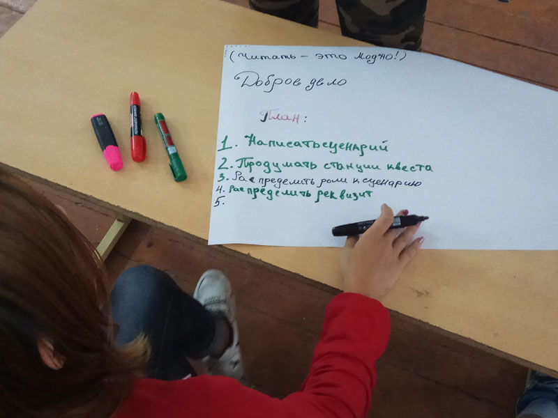 В ходе встреч ребята вместе с библиотекарями Центра молодёжных инноваций ответили на такие вопросы, как: Кто такой волонтер? Какие направления волонтерской деятельности существуют? Что такое «культурное волонтерство»? Кто такие волонтеры чтения? Наибольший интерес вызывала практическая часть, когда подростки, поделившись на команды, разработали собственные проекты по продвижению чтения. Идей было очень много, среди них: квест по творчеству С.А. Есенина «По стопам хулигана…»; выпуск журнала «Читариум» с художественными произведениями, советами по грамотному чтению для юных любителей литературы, интеллектуальными задачами, кроссвордами, ребусами; челлендж «Stop wi-fi», предлагающий на 24 часа отказаться от использования Интернета и провести это время за чтением книг или гуляя на свежем воздухе. В ходе презентаций между командами нередко возникали бурные обсуждения на тему, что можно добавить или изменить, чтобы улучшить проекты.