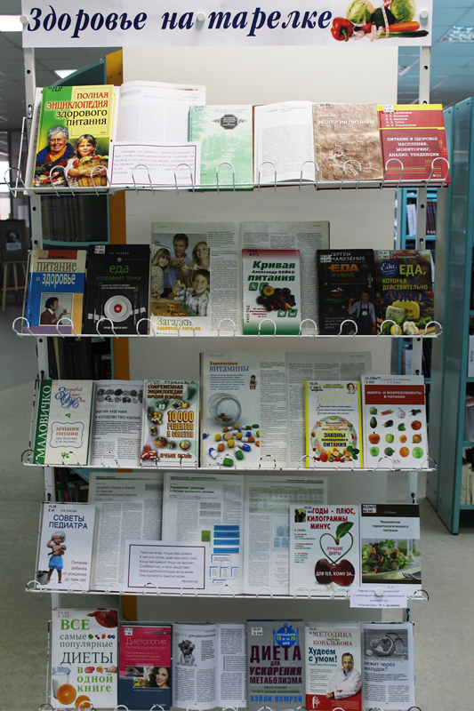 Внимание участников лекции привлекла книжная выставка «Здоровье на тарелке», подготовленная сотрудниками библиотеки. Экспозиция рассказывает о продуктах и блюдах, которые приносят радость, помогают сохранить молодость, красоту и здоровье; о различных диетах и системах питания.