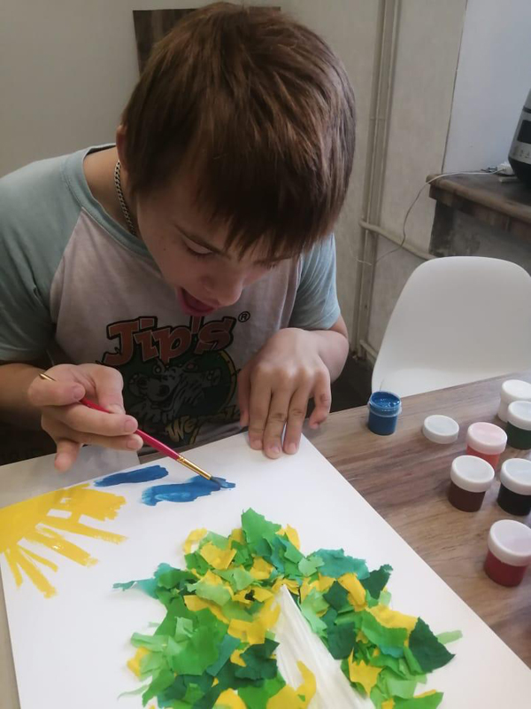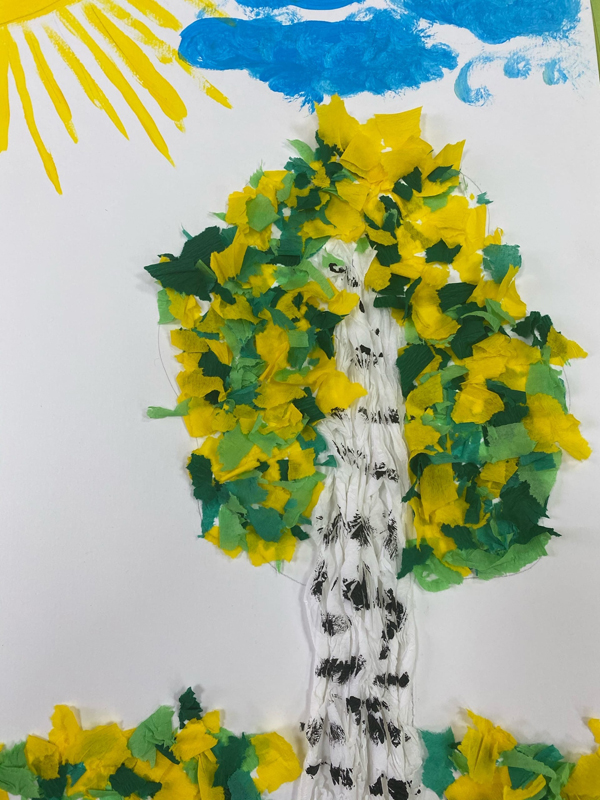 В ходе занятия ребята с удовольствием погрузились в творческий процесс: раскрашивали гуашью солнышко и облака, увлечено рвали и скручивали разноцветную бумагу, а потом склеивали ее, создавая форму «есенинской» березы.