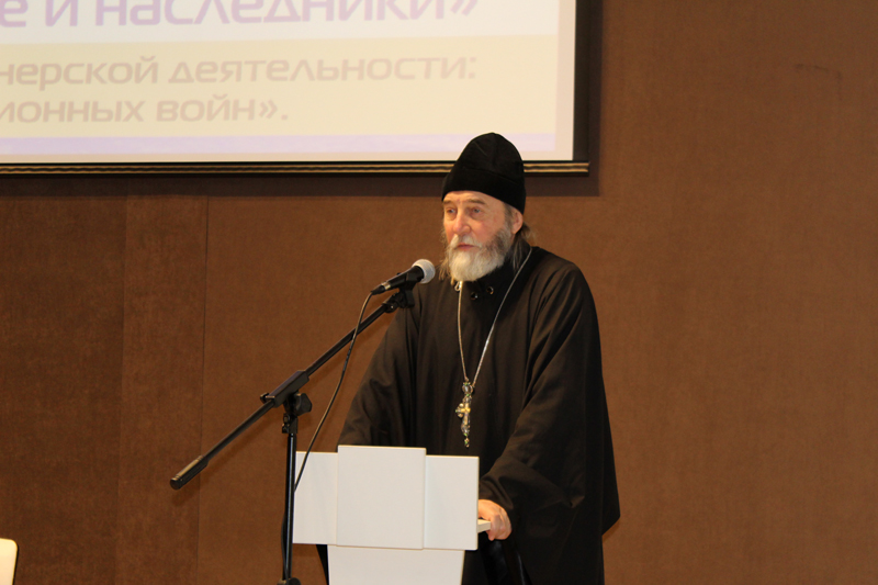 Протоиерей Сергий Рыбаков, председатель отдела религиозного образования и катехизации Рязанской епархии, заведующий кафедрой теологии Рязанского государственного университета имени С.А. Есенина, кандидат физико-математических наук, в докладе «Политика и религия в современном информационном аспекте» поставил вопрос о том, светское ли у нас государство. Прослеживая тему от императора Петра I до современности, докладчик констатировал ряд важных мыслей: история не приобрела достаточной целостности в этноисторическом и конфессиональном аспектах; акт Великой Победы мы не освещаем должным образом, эта Победа – главная в череде многих побед.