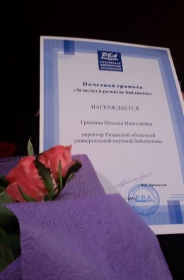 На заключительном пленарном заседании директор Рязанской областной универсальной научной библиотеки имени Горького Наталья Гришина за вклад в развитие библиотек награждена Почетной грамотой Российской библиотечной ассоциации. Наши искренние и сердечные поздравления Наталье Николаевне. Это еще один повод в многочисленной череде событий, чтобы мы гордились своим директором.