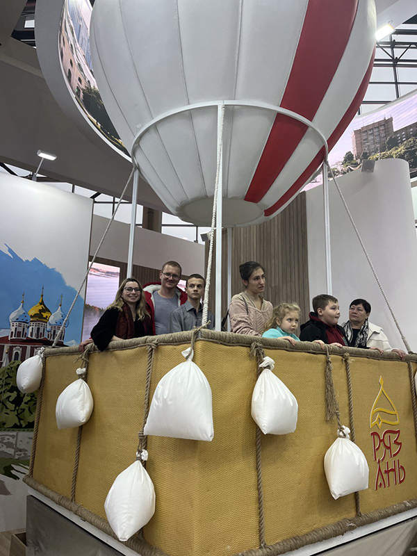 Ну и, конечно, мы торопились посетить площадку родной Рязанской области. Отметили, что на ней кратко и емко представлено то, чем славится регион. Сразу обращает внимание длинная очередь из желающих совершить путешествие на воздушном шаре.