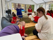 Для самых маленьких гостей руководитель любительского театра «Атмосфера» библиотеки Горького Наталия Королева и одна из актрис театра провели интерактивный спектакль «Золотая рыбка» по мотивам сказки А.С. Пушкина «О рыбаке и рыбке». Сказочница Настасья Микулишна и ее помощники рассказали сказку, поиграли в русские народные игры и пообщались с детьми о пользе чтения.