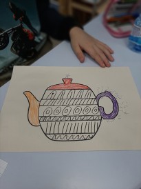 Преподаватель с ребятами играли в «Ухо-нос» (специальное упражнение на координацию), разминали пальцы, отхлопывали ритм, учились слушать команды, а потом нарисовали каллиграфический чайник. Таким образом, в игровой форме была проведена начальная диагностика.