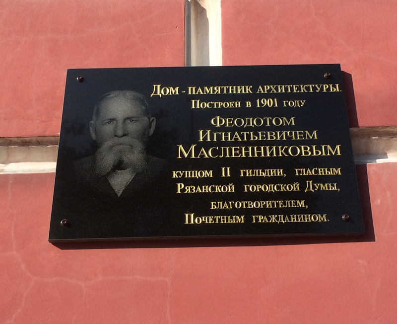 На угловом доме по улице Павлова (ранее Никольская) и Первомайскому проспекту (ранее Московская) установлена мемориальная доска, посвященная Феодоту Масленникову – церковно-общественному деятелю, лидеру рязанского старообрядчества, купцу, лесопромышленнику, благотворителю.