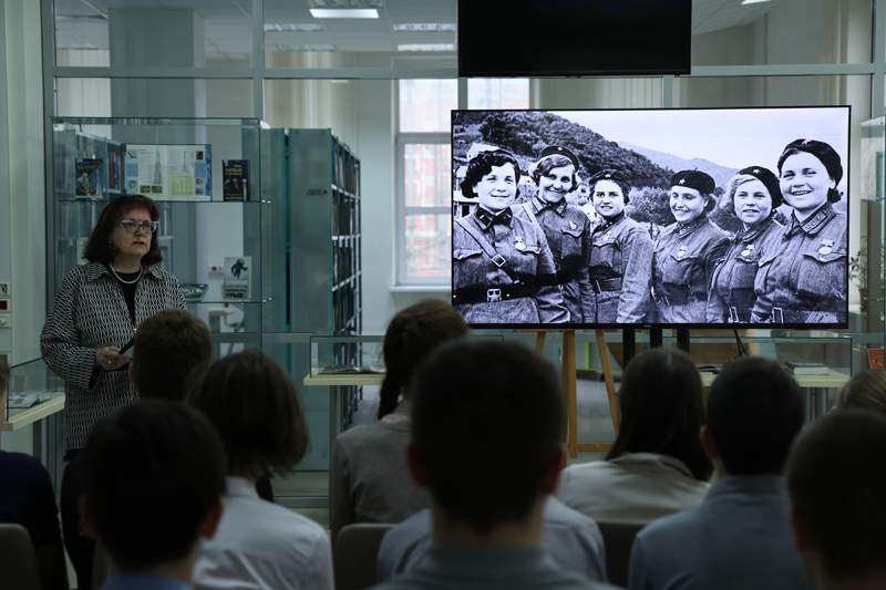 Сегодня сотрудники универсального читального зала провели для учащихся восьмых классов школы № 44 литературно-документальную программу «Женское лицо Победы», посвящённую женщинам – участницам Великой Отечественной войны.