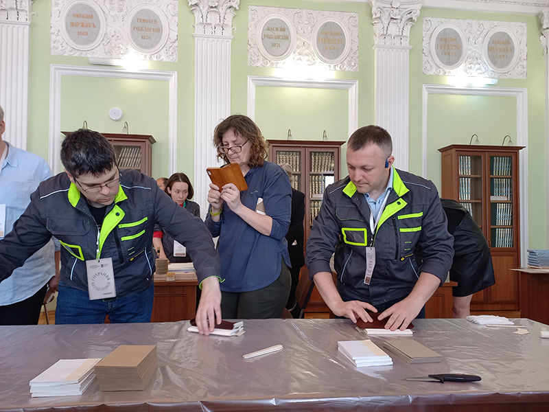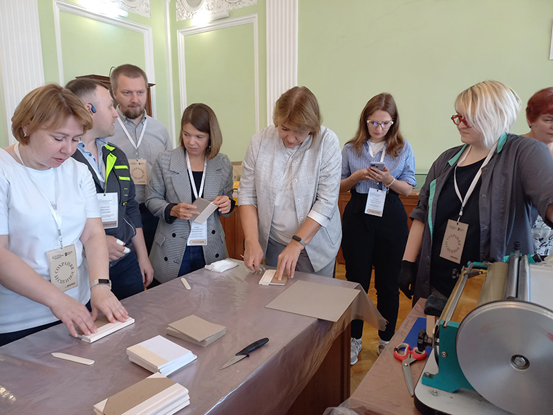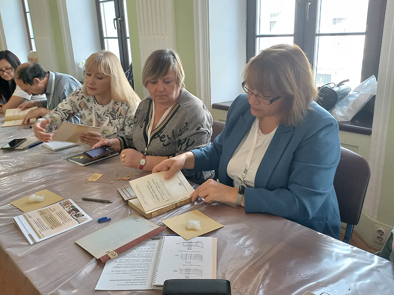 Сотрудники РГБ познакомили слушателей с теорией и технологией создания библиотечного переплета, материалами и оборудованием для этого процесса. Участники практических занятий узнали о подготовительных работах, о материалах для переплета, разборке и обработке книг, методах и видах ручного шитья. Кроме того, специалисты переплетного отдела продемонстрировали, как эффективно можно организовать конвейер для переплета массовых изданий при небольшом штате сотрудников, чтобы значительно увеличить количество переплетаемых документов.