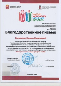 Министр культуры Челябинской области А.В. Бетехтин и директор Челябинской областной универсальной научной библиотеки Н.И. Диская выразили благодарность Рязанской областной универсальной научной библиотеке имени Горького за многолетнее сотрудничество, активное участие и партнерское взаимодействие в подготовке и проведении Межрегиональной выставки «Южноуральская книжная ярмарка – 2018».