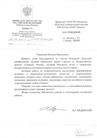 Наша библиотека получила благодарность от Министра культуры Российской Федерации В.Р. Мединского за организацию и проведение в Рязанской области Всероссийского проекта «Символы России», организованного Министерством культуры РФ, Российской государственной детской библиотекой, Российским историческим обществом.