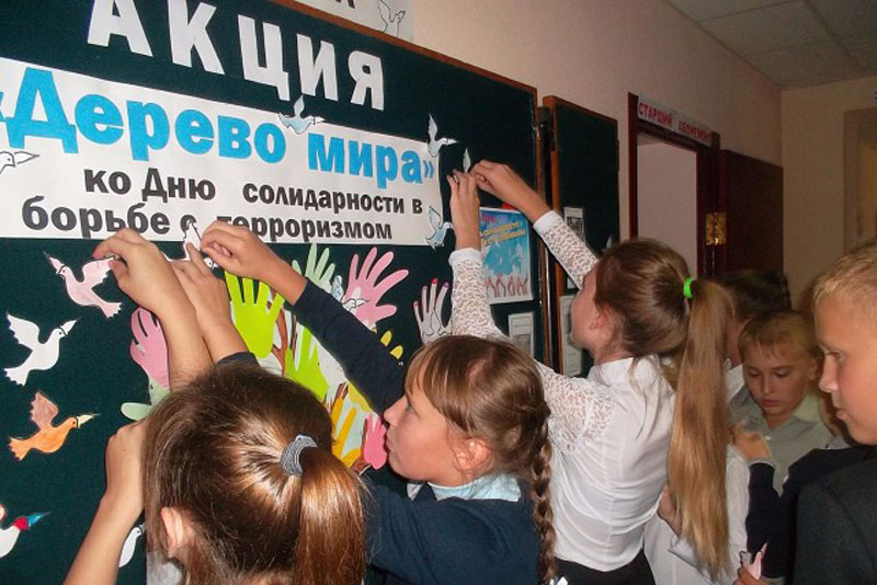 В ходе акции каждый посетитель библиотеки письменно выразил свои мысли о мире и терроризме. Тексты, написанные читателями на символических листочках-ладошках, были прикреплены к «Дереву мира». На стенде была размещена информация о Дне солидарности, буклеты: «Беслан. 1 сентября 2004 года», «Терроризм – угроза обществу, личности, государству».