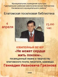 4 апреля в Елатомской поселковой библиотеке Касимовского района состоялся вечер «Не может сердце жить покоем», посвященный 75-летию поэта, писателя, краеведа Геннадия Ивановича Грязнова. Юбилей совпал с 60-летием его творческой деятельности. Вся жизнь этого человека наполнена любовью к поэзии и родному краю.