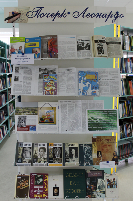В универсальном читальном зале работает книжная выставка «Почерк Леонардо». Познакомившись с материалами выставки, вы узнаете: какие проблемы развития у леворуких детей, каковы особенности работы мозга леворуких людей.