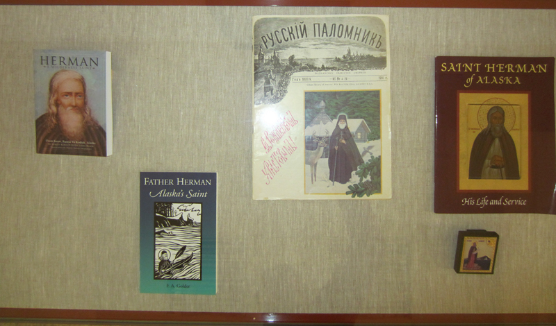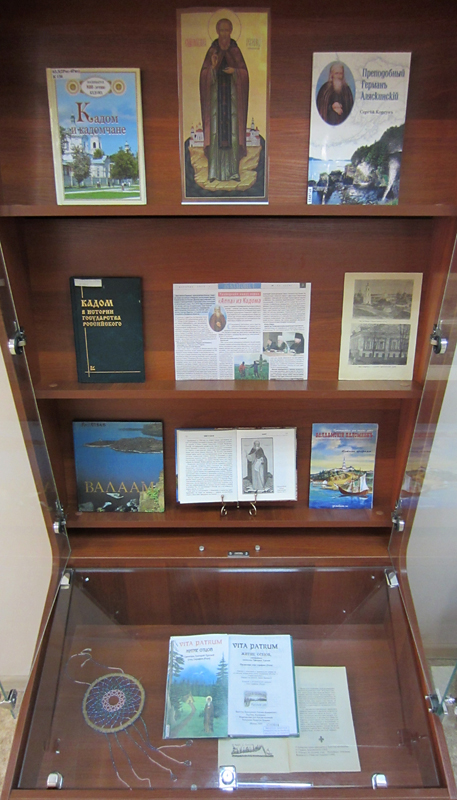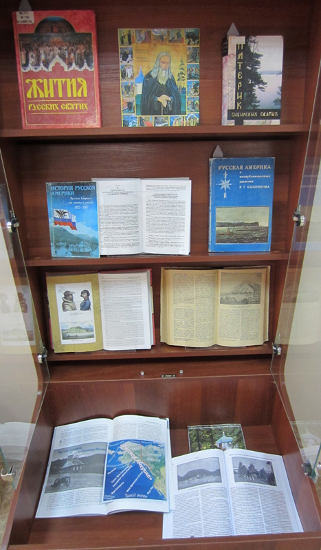 На выставке представлены книги из фондов библиотеки им. Горького, которые прослеживают жизненный и духовный путь уроженца Рязанского края, а также книга-исследование Сергея Корсуна «Преподобный Герман Аляскинский».