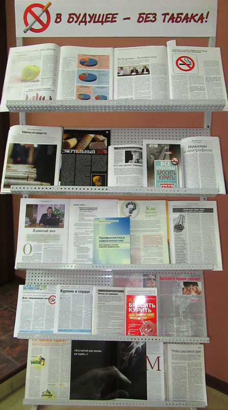 Кафедра периодических изданийВ зале периодических изданий работает выставка «В будущее без табака!». Всемирный день отказа от курения отмечается ежегодно 31 мая. Он провозглашён в 1988 году Всемирной организацией здравоохранения и входит в систему всемирных и международных дней ООН.