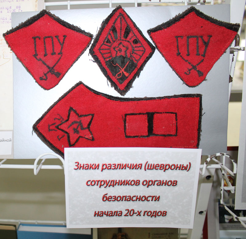 Особое внимание обращают на себя подлинные знаки различия (шевроны) сотрудников органов государственной безопасности начала 20-х годов.