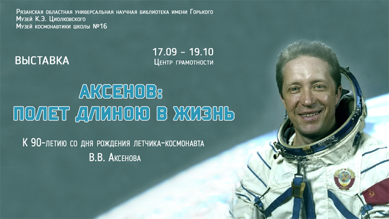 Центр грамотностиНа выставке, посвящённой 90-летию со дня рождения Владимира Викторовича Аксенова, представлены уникальные экспонаты, книжные и периодические издания, позволяющие глубже узнать о жизни и деятельности лётчика-космонавта, а также о выдающихся достижениях отечественной космонавтики.