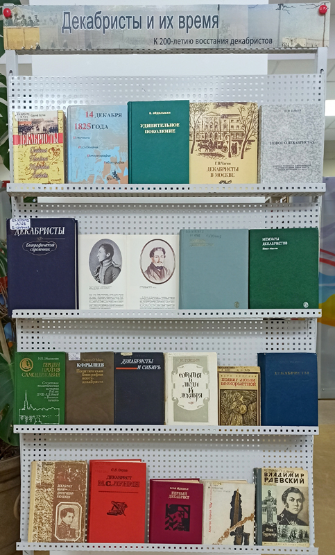 В честь 200-летия со дня восстания декабристов в центре книги и чтения оформлена выставка. В экспозиции представлены книги, выпущенные в разные годы. Этим и интересен взгляд на исторические события, произошедшие в 1825 году. Литература освещает формирование декабристской идеологии, деятельность декабристских организаций, подготовку и проведение восстания, суд над декабристами и их последующую судьбу.