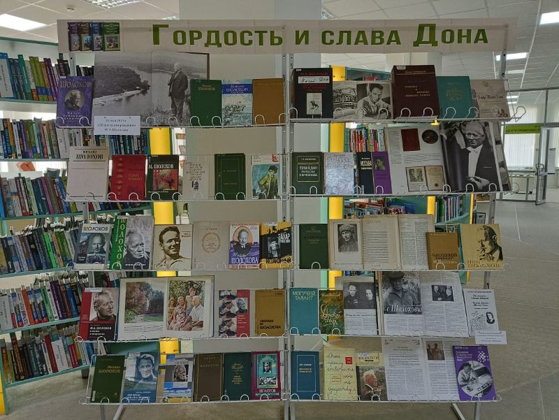 В универсальном читальном зале работает книжная выставка «Гордость и слава Дона». На ней представлены основные произведения автора, которые раскрывают главную тему всенародно любимого писателя – тему русского характера, а также книги и журнальные статьи о жизненном и творческом пути, письма, воспоминания близких.
