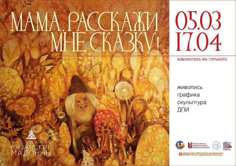 Выставка «Мама, расскажи мне сказку!» организована Рязанской областной универсальной научной библиотекой имени Горького совместно с региональным отделением Союза женщин России и Рязанской областной организацией Союза художников России при поддержке Общественной палаты Рязанской области. Открытие состоится в рамках IX регионального фестиваля «Рязанские мадонны».
