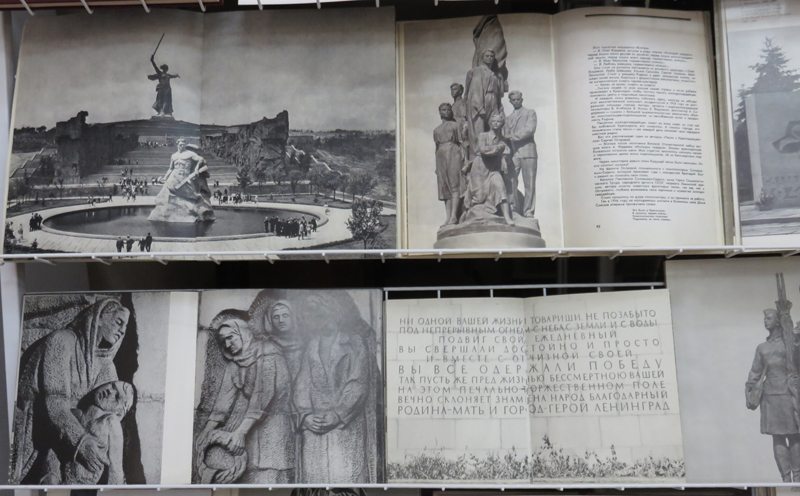 На выставке представлены книги, альбомы с фотографиями памятников, мемориалов, скульптурных монументов.