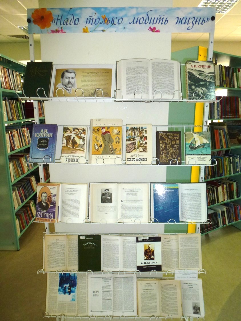 Сотрудники универсального читального зала к юбилею писателя организовали книжную выставку, на которой представлена литература о жизни и творчестве Александра Куприна, его произведения и статьи о нем из периодических изданий.