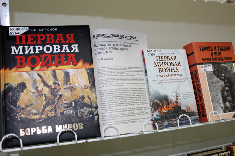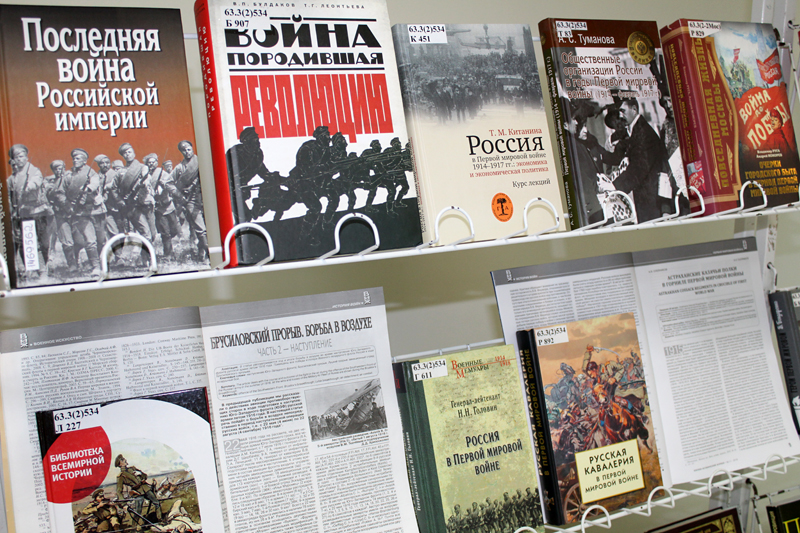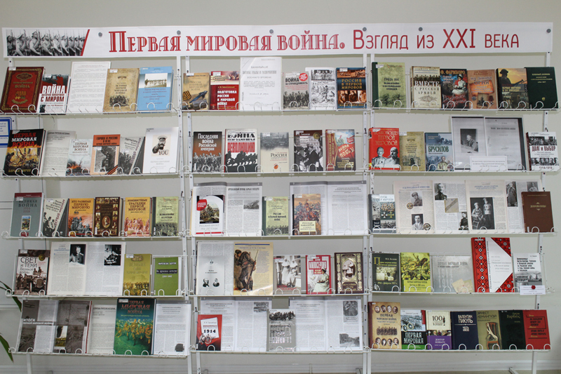 В универсальном читальном зале организована книжная выставка «Первая мировая война. Взгляд из XXI века», посвященная этой памятной дате. На выставке представлены книги и периодические издания об эпохе того времени, о причинах возникновения войны, об участии России в боевых действиях, а также о героях-россиянах, проявивших личную храбрость на полях сражений.