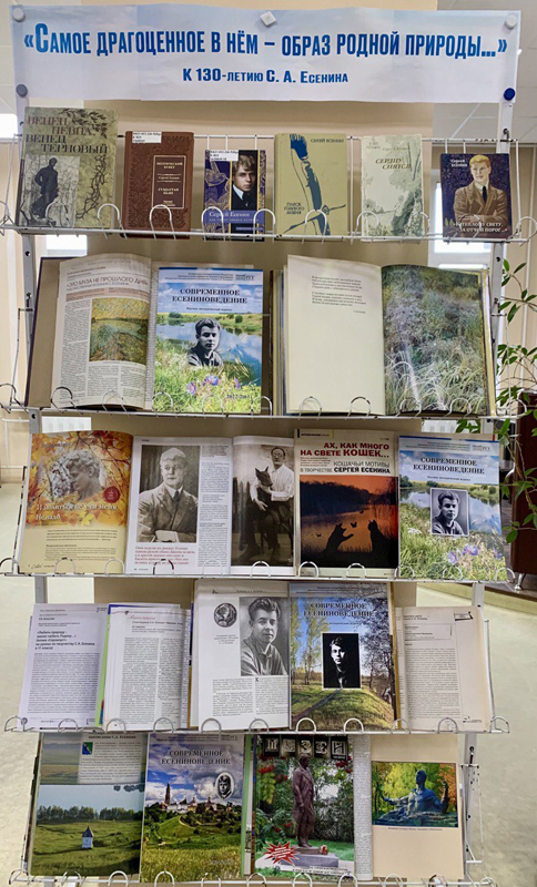 К 130-летию со дня рождения Сергея Александровича Есенина в зале периодических изданий работает выставка, на которой представлены сборники стихотворений поэта, альбомы с фотографиями пейзажей родной поэту Рязанской земли, статьи ученых-филологов и педагогов, адресованные как широкой аудитории поклонников творчества Сергея Есенина, так и краеведам, преподавателям литературы, студентам и учащимся.