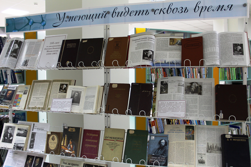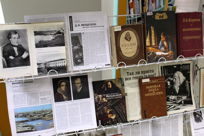 В читальном зале открыта книжная выставка, посвященная жизни и научной деятельности Д.И. Менделеева. В экспозиции представлены документы о детстве и студенческих годах ученого, о его личной жизни и семье. Особое внимание уделено работам по открытию и разработке периодического закона химических элементов и его трудам по химии, физике, метрологии, экономике, геологии, метеорологии, педагогике, воздухоплаванию, приборостроению.